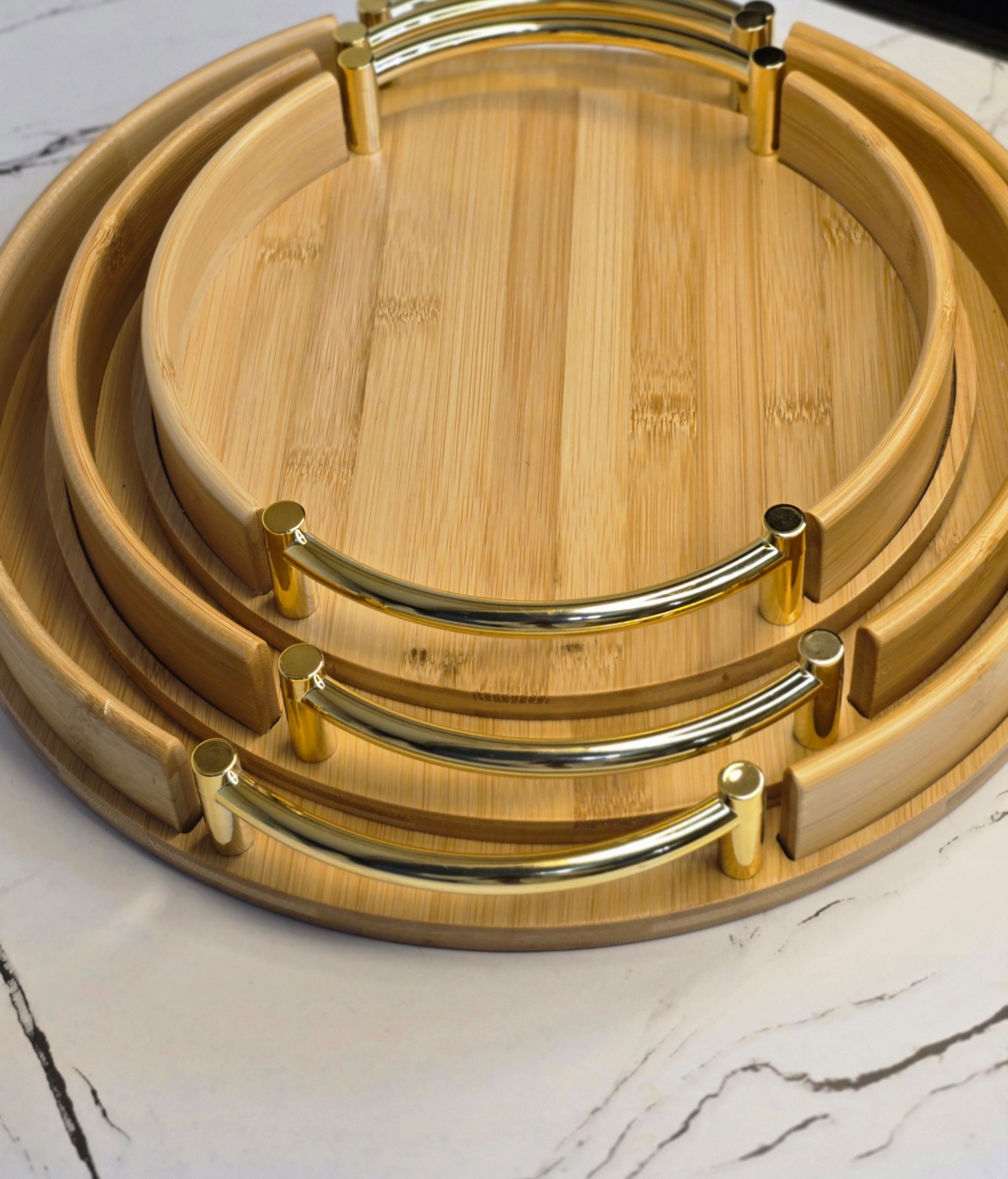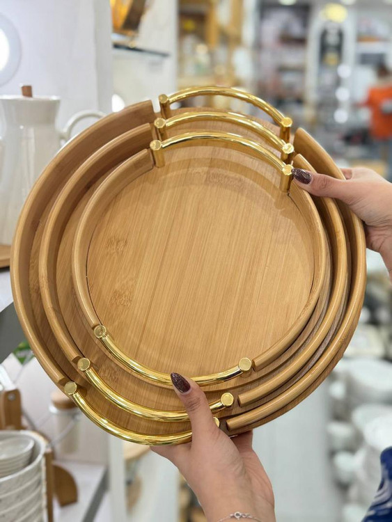 سینی گرد دسته طلایی جنس محصول بامبو سایز بزرگ قطر 34/5 ارتفاع 6 سایز متوسط قطر 30 ارتفاع 6 سایز کوچک قطر 25 ارتفاع 6