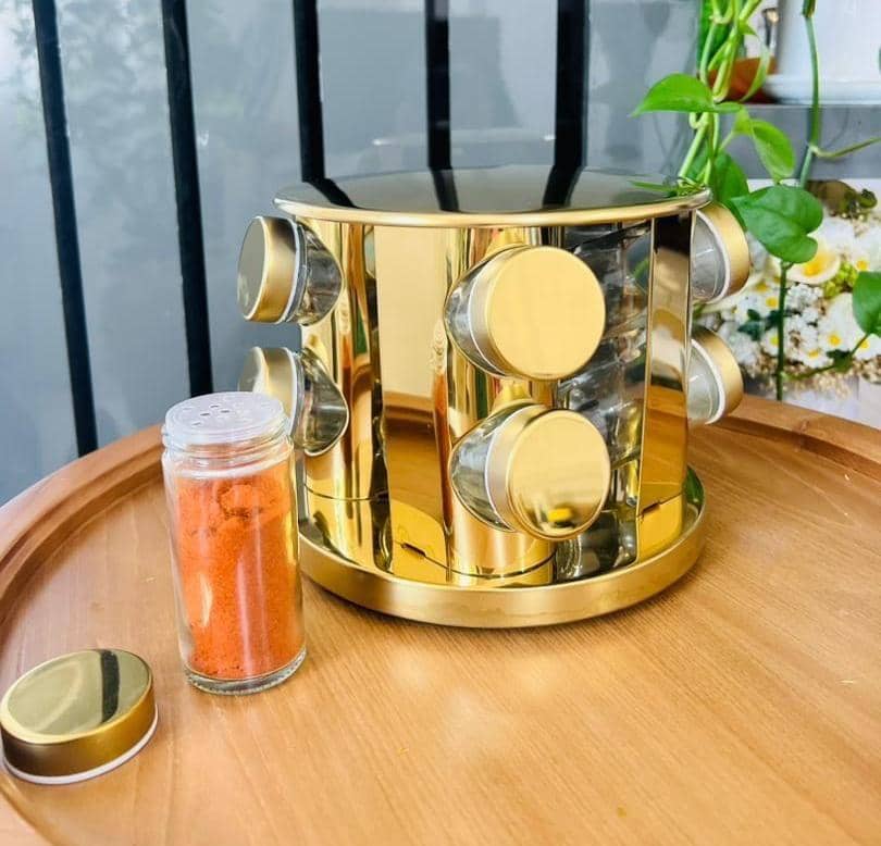 جا ادویه تمام طلایی استیل گرد مدل نمکپاشی درب استیل پیچی جنس جاادویه ها شیشه ارتفاع هرشیشه 9/7سانتی متر